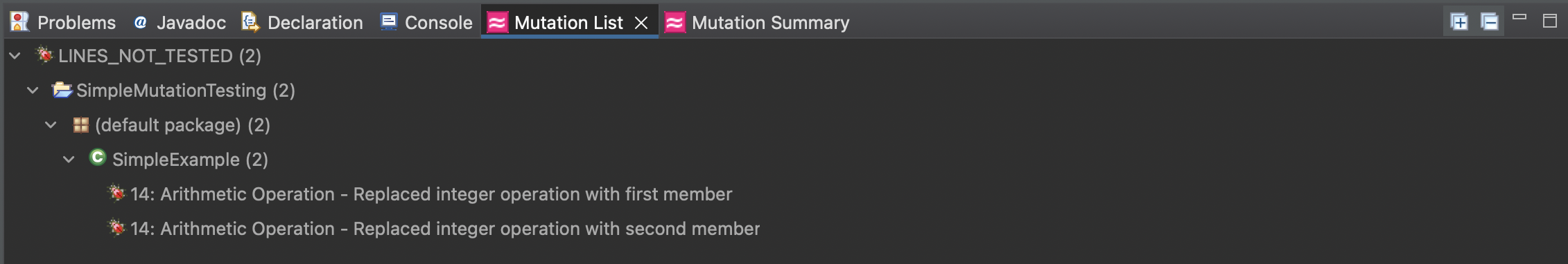 If we have no test cases execute this code, the test process will generate the following mutations in the LINES_NOT_TESTED group under the Mutations List tab. (The icons for unresolve mutants are shown as “red bugs”.)
